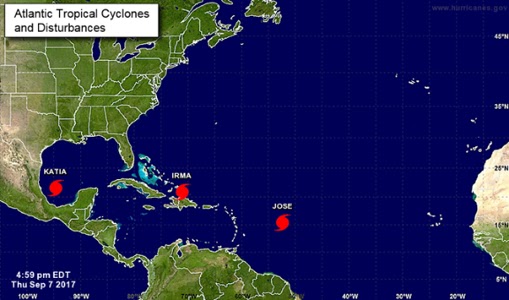 Junto a estos dos huracanes, también está activo Katia, que se encuentra estacionario frente a las costas de México con vientos máximos sostenidos de 80 millas por hora (130 km/h).